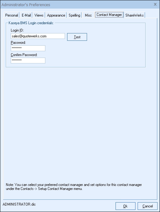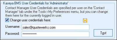 Since these are user-based credentials, you will also need to enter these on the Contact Manager tab under Tools > My Preferences, for each user setup in QuoteWerks as shown in the screen shot below.