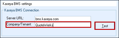 Step 5: Enter your Company/Tenant name into the Company/Tenant field and then click on the [Test] button to ensure the URL and Company/Tenant are correct.