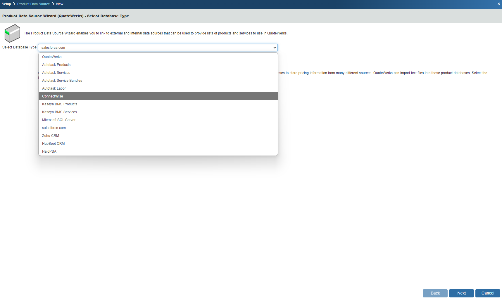 QuoteWerks can link directly to your ConnectWise Product Database: view the Linking to ConnectWise Product List topic for information on setting up this feature.
