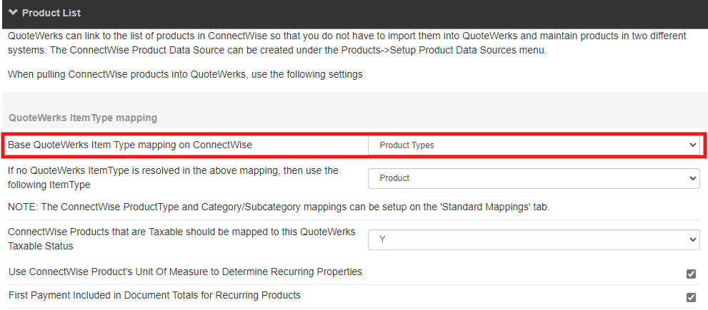 On the Products > Product List tab under the QuoteWerks Contacts -> Setup Contact Manager menu > ConnectWise dialog, you will determine how you are linking products between QuoteWerks and ConnectWise. Secondly, you'll determine what occurs if no mapping exists, and what to default a line item’s Item Type to when either saving the line item to an Opportunity or pulling the product from the ConnectWise linked product database. The latter of the selections,selects the QuoteWerks Item Type for the products. This will correspond to the selections made on the Products > Mappings tab.