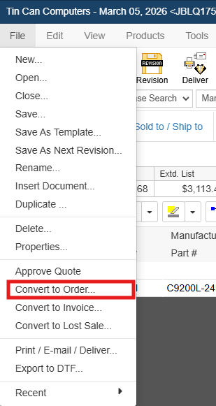 Once a customer accepts a quote, you can choose to convert the quote document to an order document. You can convert your quote to an order by selecting the File -> Convert to Order menu.
