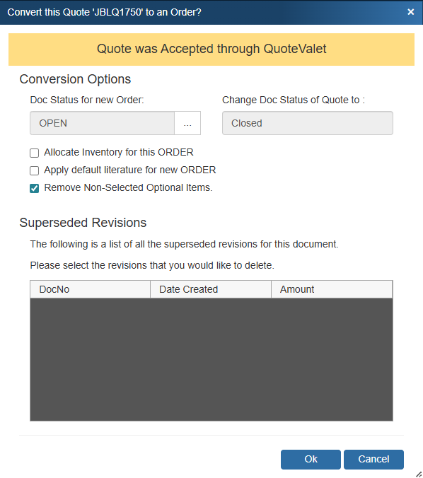 Alternatively, when a customer accepts a quote on QuoteValet you will be prompted to convert the quote to an order when you click on the QuoteValet tab.
