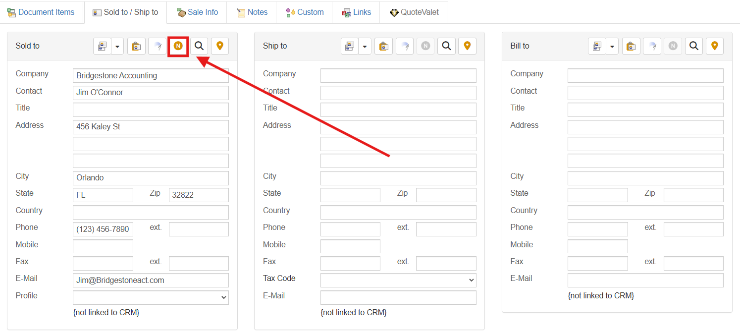 If the customer does not exist in Act! for Web, you can create them from QuoteWerks by filling in the required information on the Sold to/Ship to tab. When you fill in the required information the gold create button () will be available and let you create the new account in Act! for Web.  However, if the company does exist and you simply need to add a contact to an existing account in Act! for Web, you will have to add the contact to Act! for Web from Act! for Web.