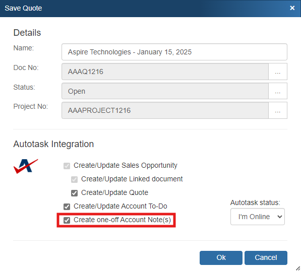 After you hit [Ok] and have created the opportunity, you have the ability to create an Autotask Account Note: