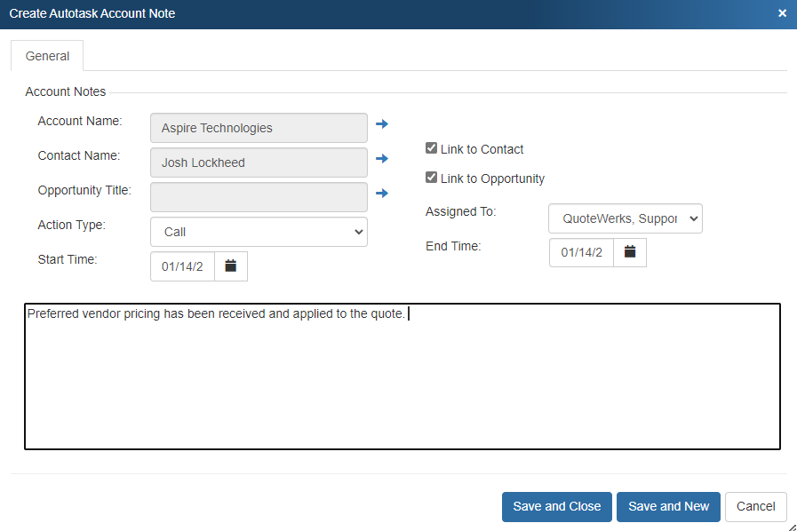 This note can be linked to the account, contact, and the opportunity. This enables users to create notes for other Autotask users about this particular quote including follow-up calls, meetings, notes, etc.. You also have the option of creating just 1 [Save and Close] or creating many [Save and New].