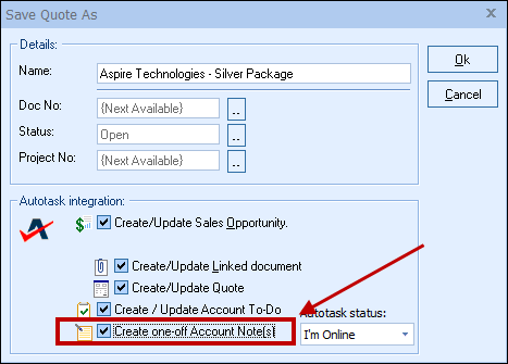 After you hit [Ok] and have created the opportunity, you have the ability to create an Autotask Account Note:
