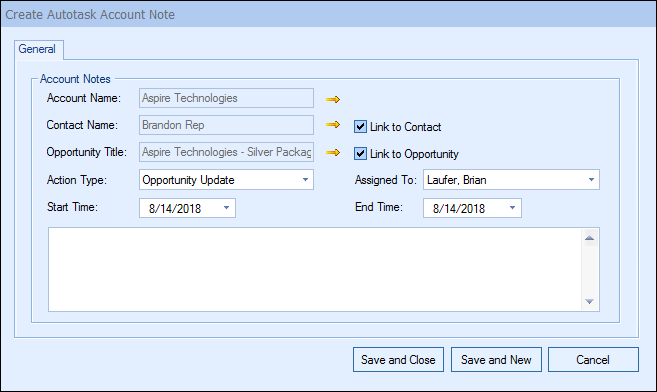 This note can be linked to the account, contact, and the opportunity. This enables users to create notes for other Autotask users about this particular quote including follow-up calls, meetings, notes, etc.. You also have the option of creating just 1 [Save and Close] or creating many [Save and New].