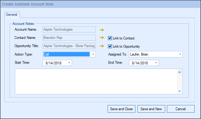This To Do can be multiple different action types available in Autotask including calls, meetings, opportunity updates, events, and more. The To Do can be linked to the contact and the opportunity and can be assigned to other Autotask users. There's also a notes field to add more information about this To Do item.