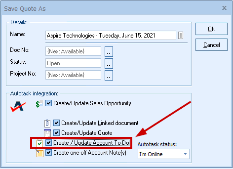 After you hit [Ok] and have created the opportunity, you have the ability to create an Autotask To Do: