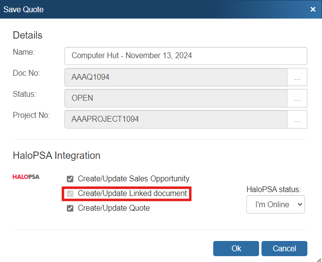 When saving a new quote, and HaloPSA is running, a “Create/Update linked document” checkbox will appear on the Save Quote As window (as shown in the screen shot).