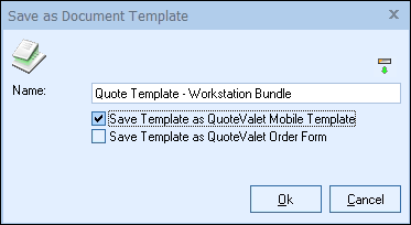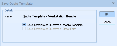 Check the Save Template to QuoteValet Mobile box and click on the [Ok] button. If you do not check this box, this template will not be uploaded to QuoteValet Mobile.