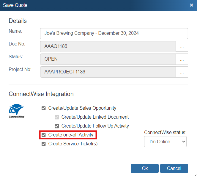 Unlike creating or updating a follow-up call, this option will create a one-off activity in ConnectWise every time you save the document with Create one-off Activity selected.