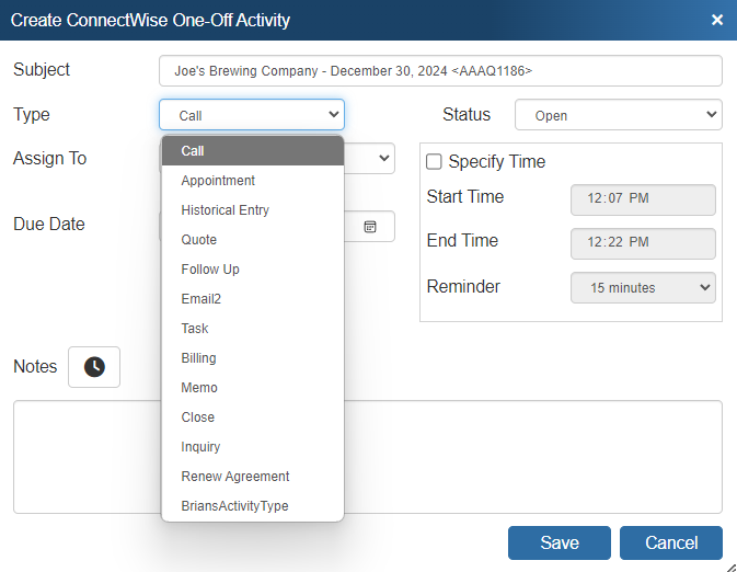 Once you've clicked the [OK] button from the File -> Save menu, the Create ConnectWise One-Off Activity window will appear, allowing you to adjust information about the activity such as the Subject, Reminder, Due Date, Start Time, End Time, and Notes. You can also choose what type of activity you'd like to schedule from the Type drop-down box, as well as who you'd like to assign the activity to. The latter is very useful if you need to assign someone to the activity who didn't create the quote. There is also a