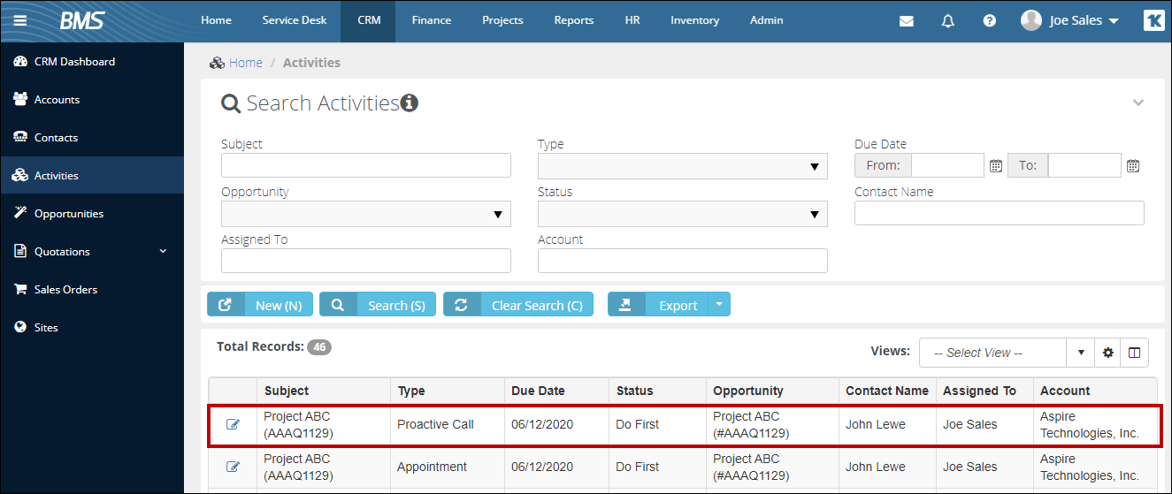 In Kaseya BMS, the activity will be listed under the Activities menu as well as under the Contact.