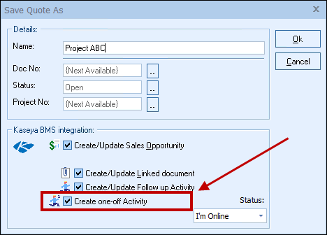 When you save a document, the Create one-off Activity checkbox will appear on the Save Quote As window.
