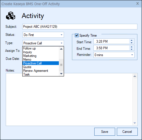Once you've clicked the [OK] button from the File -> Save menu, the Create Kaseya BMS One-Off Activity window will appear, allowing you to adjust information about the activity such as the Subject, Status, Type, Assign To, Due Date, Start and End Time, and Reminder. You can also choose what type of activity you'd like to schedule from the Type drop-down box, as well as who you'd like to assign the activity to. The latter is very useful if you need to assign someone to the activity who didn't create the quote. There is also a