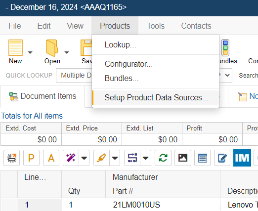 The new product database that was created will now be visible from the Products -> Lookup menu which is where you can add products to this database. This is also where you will select the products that you would like to add to your quote.