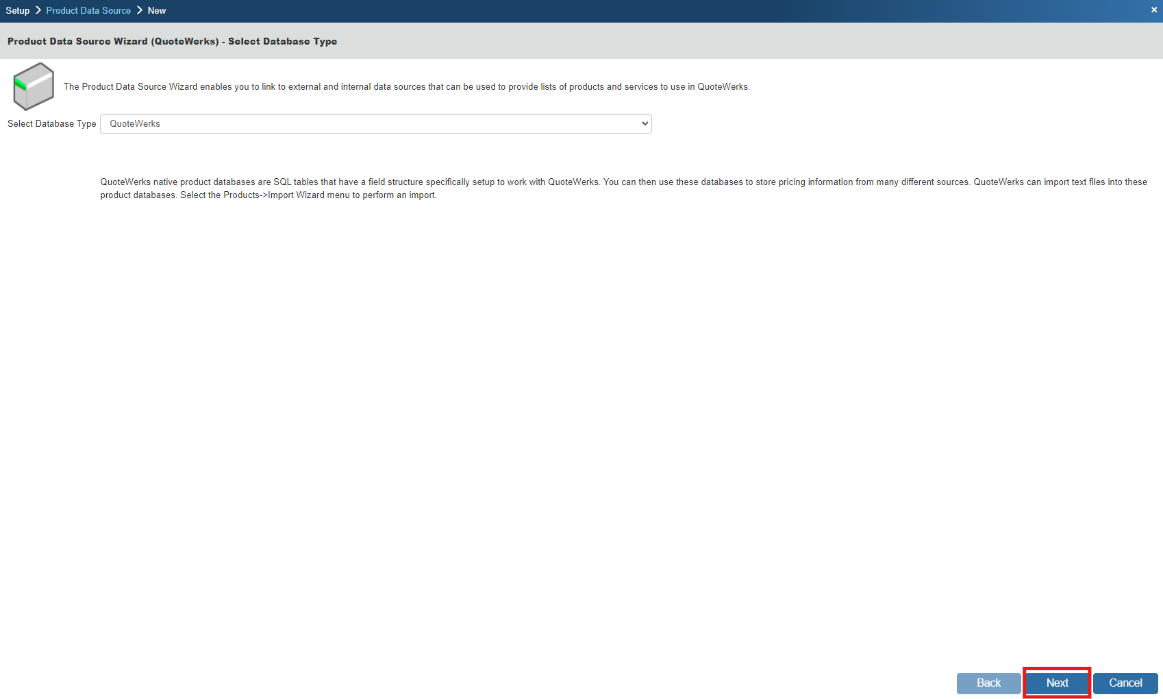 Step 2: To create a native product database select QuoteWerks from the “Select Database Type” drop down menu. By default the database type will be QuoteWerks.