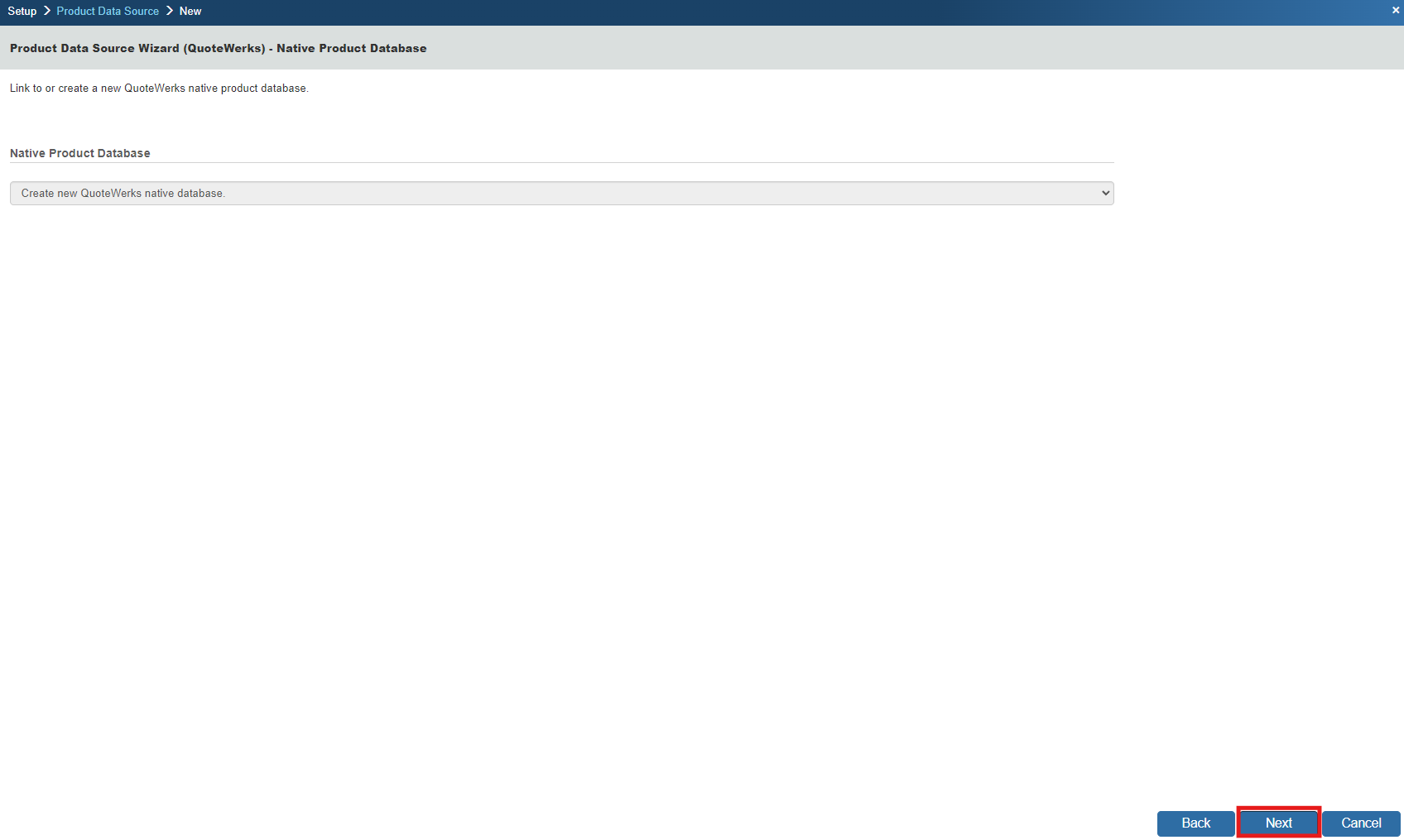 Step 3: By default the “Create new QuoteWerks native database” option will be selected:
