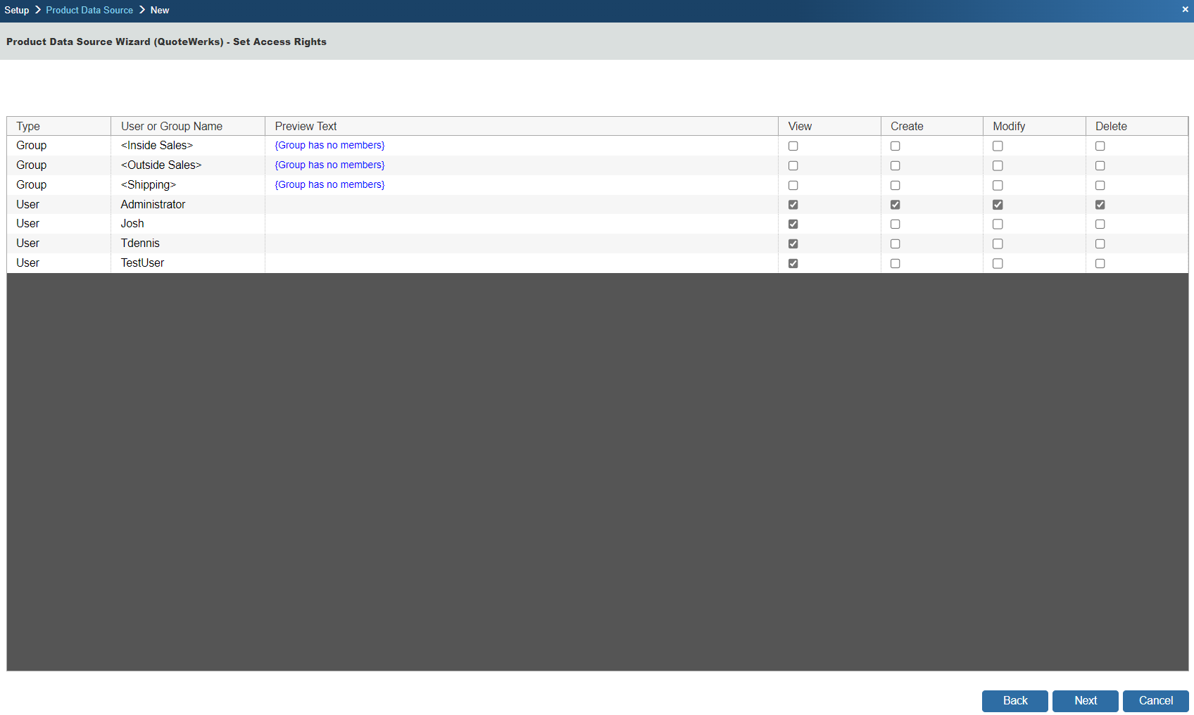 Step 4: If the ‘Individual Product Data Source level security’ has been enabled, the Set Access Rights step will appear next: