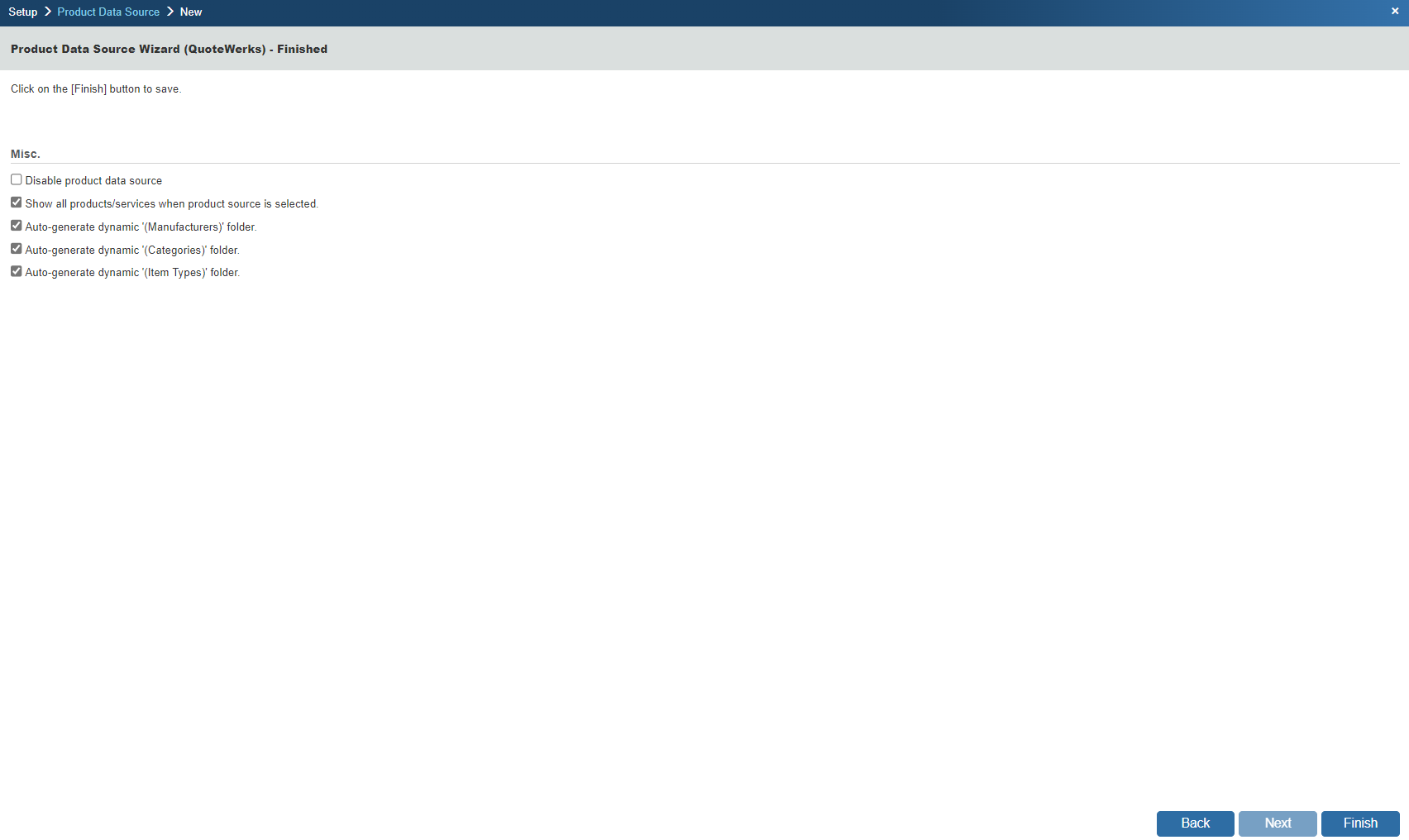 In native product databases, you can choose to have QuoteWerks auto-generate a unique list of of the categories found in the product database. For details on this feature, see the Organizing Products in Folders Chapter.