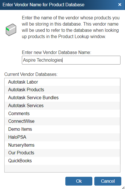 Step 7: Enter the database file name you would like to use to store this vendors products. The database name will be the name of the database file that will be saved to the QuoteWerks directory. Example; vendor name “Aspire Technologies” will become “Aspire Technologies.mdb” in the QuoteWerks directory:
