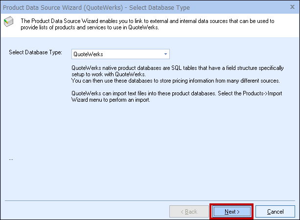 Step 2: To create a native product database select QuoteWerks from the “Select Database Type” drop down menu. By default the database type will be QuoteWerks.