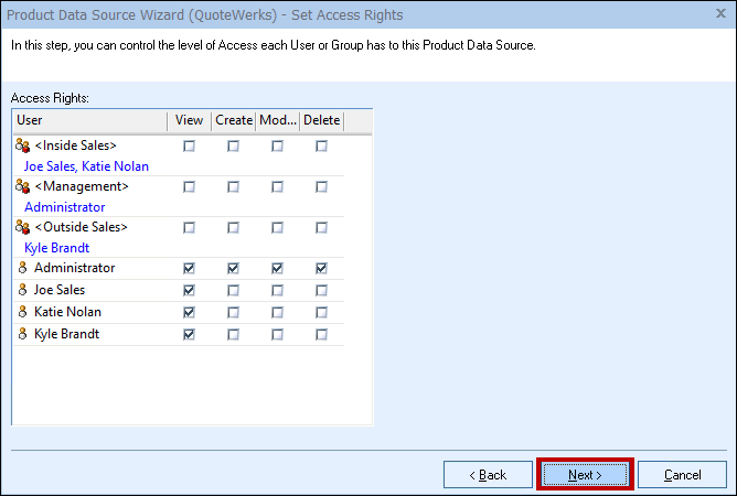 Step 4: If the ‘Individual Product Data Source level security’ has been enabled, the Set Access Rights step will appear next: