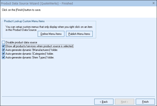In native product databases, you can choose to have QuoteWerks auto-generate a unique list of of the categories found in the product database. For details on this feature, see the Organizing Products in Folders Chapter.