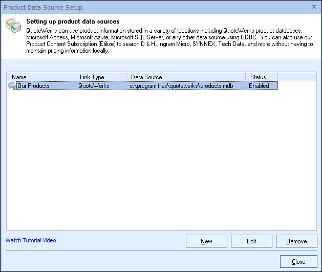 When the access backend of QuoteWerks is installed, it creates a default product source called “Our Products” with the physical database name of products.mdb. In the MS SQL backend of QuoteWerks, the table name is products_myproducts_products, found in the QuoteWerks database. When you create additional native product sources you will be given the option to specify the physical database file or table name of the product source, and a more descriptive name (most often the vendor name whose products you will store in this database) that will be used to refer to the database from within QuoteWerks. The descriptive names of the native product sources will be displayed when looking up products on the Product Lookup window. When products are added to the quote from this product source, this descriptive name will be placed in the Vendor column for the product.
