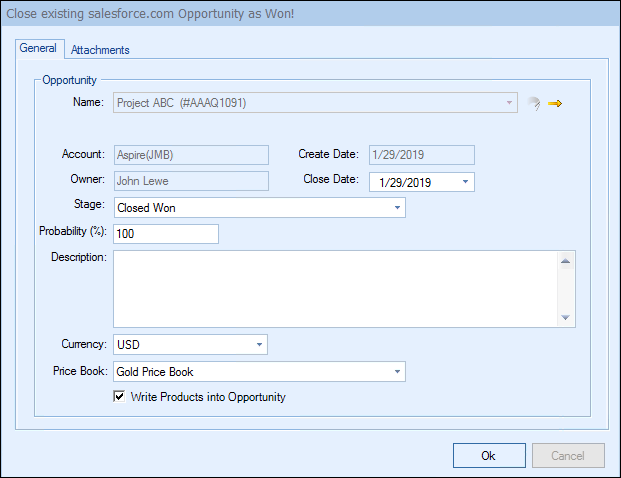 Once you have clicked the [OK] button from the File -> Save window, the “Close existing salesforce.com Opportunity as Won” window will appear allowing you to enter information about the completed sale such as Name, Amount, Close Date, Stage, and Probability.
