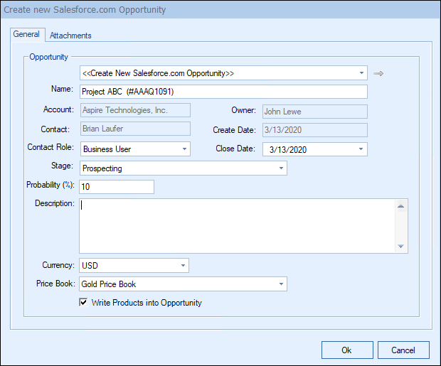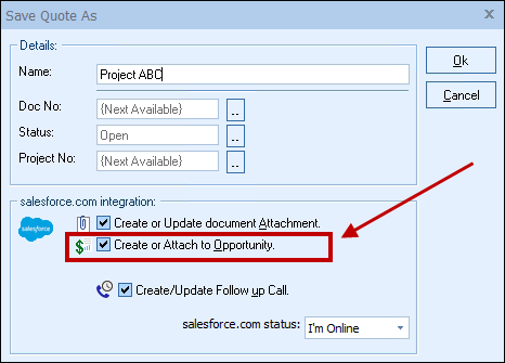 This option will create a salesforce.com opportunity or attach to an existing opportunity in salesforce.com under the Opportunities tab. Once you have pressed the [OK] button from the File -> Save window, the “Create a new salesforce.com Opportunity” window will appear.