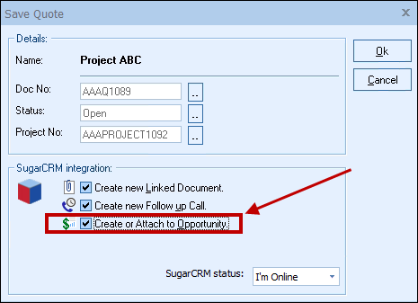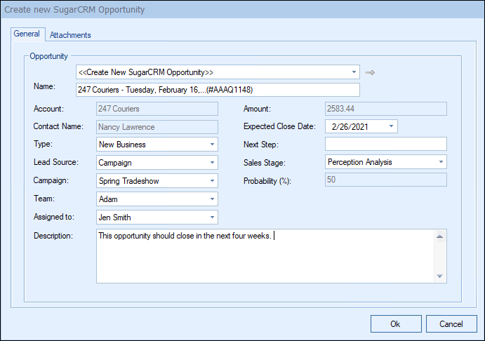 Once you click [Ok], this option will create or update a SugarCRM opportunity or attach to an existing opportunity in SugarCRM under the Opportunities heading.