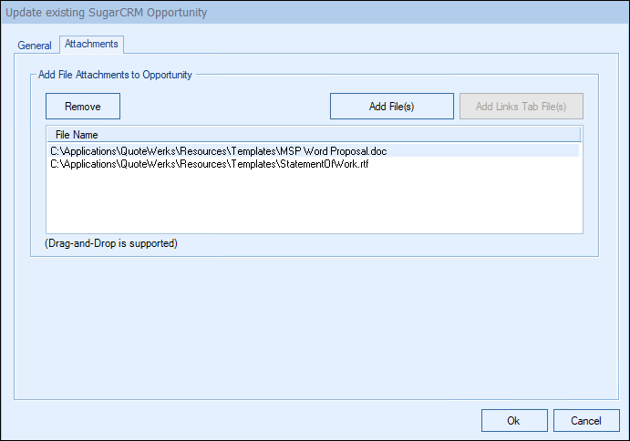 You can either select a file using a file selection dialog [Add File(s)], or choose a file that is already linked to the quote under the Links tab on the Quote WorkBook [Add Links Tab File(s)]. This is very useful for attaching a PDF version of the quote to the SugarCRM Opportunity. Having a PDF version of the quote is an advantage because anyone can then view the quote - they do not have to have QuoteWerks installed on their machine to view the quote. You can attach multiple PDF files to the opportunity, so you can easily attach the customer proposal, and a no frills plain vanilla version for the service technicians to follow, and basically anything else you could want.