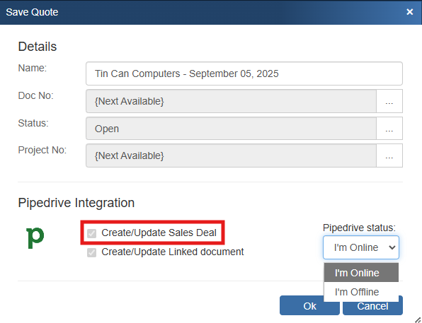 When you're saving a document, the “Create/Update Sales Deal” checkbox will appear on the Save window.