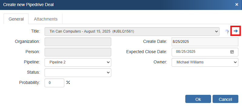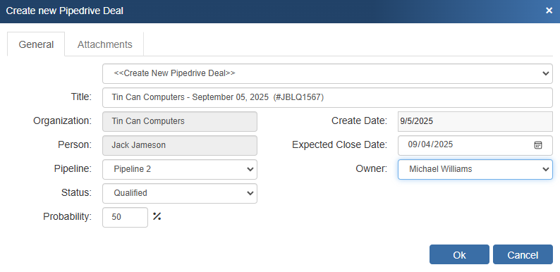 Once you have pressed the [OK] button from the File -> Save window, the “Create/Update Pipedrive Deal” window will appear, enabling you to enter or adjust information about the deal such as the Deal Name, Pipeline, Stage, Status (based on ticket type), Create Date, Expected Close Date, Probability %, and owner.