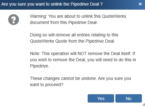 button to remove the link. All entries relating to the QuoteWerks Quote will be removed from the Pipedrive deal. This button will only be displayed when updating an existing deal, so if you realize you made a mistake, choose to update the deal, and then at that point, use this button to unlink it.