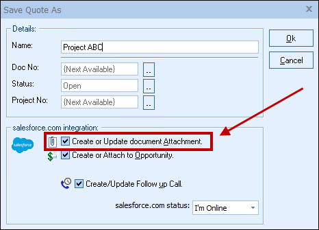 | Note: | The Create or Update document Attachment checkbox will NOT appear if you are saving a quote template. The Create or Attach to Opportunity checkbox will be checked and disabled if the Look for synchronized data in dtf files option is set. |