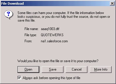 At this point it is important that you can click on the [Open] button (NOT the [Save] button) to download and open the document in QuoteWerks. If you are not logged into QuoteWerks, it will initiate a login. The quote will be opened in QuoteWerks once the user has logged in.