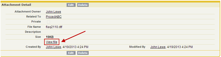 After the document has been attached to the salesforce.com opportunity, you can click on this attachment record in salesforce.com under the Notes & Attachments heading.
