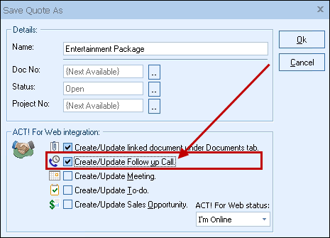 This feature will schedule a follow up call in ACT! for Web. By scheduling follow up calls, you increase your chances of closing the sale. The follow up call will be listed under the Activities tab in ACT! for Web.