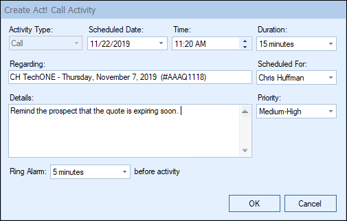If you already have a callback scheduled for this quote, QuoteWerks will display it so you can modify it.