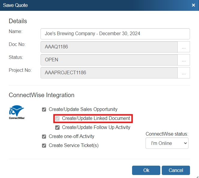 Linked documents must be attached to a ConnectWise Opportunity, so if an Opportunity does not already exist for this record, you'll need to also have the Create/Update Sales Opportunity box selected.
