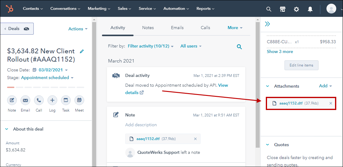When saving a quote, QuoteWerks automatically creates a link to the quote under the Attachments section of the HubSpot CRM deal: