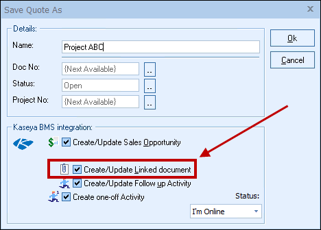 Linked documents must be attached to a Kaseya BMS Opportunity, so if an Opportunity does not already exist for this record, you'll need to also have the Create/Update Sales Opportunity box selected.