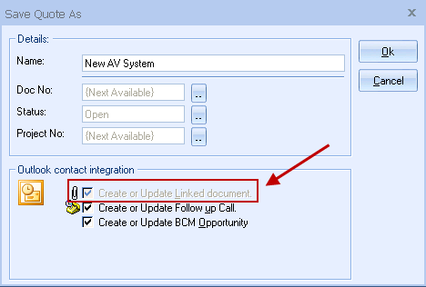 | Note: | If you have checked the box Look for synchronized data in dtf files on the Synchronization tab of the Tools -> Options menu, the “Create or Update Linked document” option will be automatically checked and unchangeable each time you save a quote. |