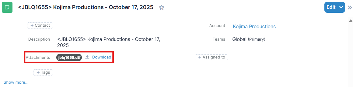 When using SugarCRM, you can choose to open this attachment by clicking on the “Subject” link under the Notes heading and then clicking the “Attachment” link in the window that displays. This will launch QuoteWerks and open the document.