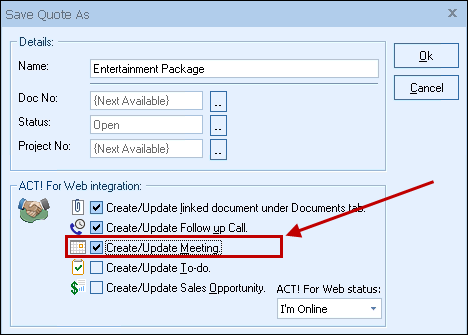 This feature will schedule a meeting related to this quote in ACT! for Web. By scheduling meetings at the time you create the quote or order, you won’t ever forget to take care of all the details related to your quote or sale. The meeting will be listed under the Activities tab in ACT! for Web.