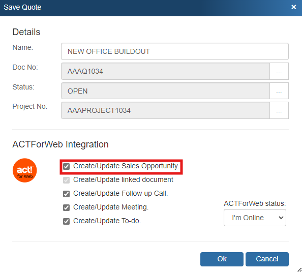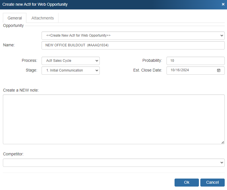 If you select this option, the Create ACT! for Web Sales Opportunity window will appear so you can review and make changes to the sales opportunity before it is created in ACT! for Web. These details include the Stage, Probability, Est. Close Date, and details.