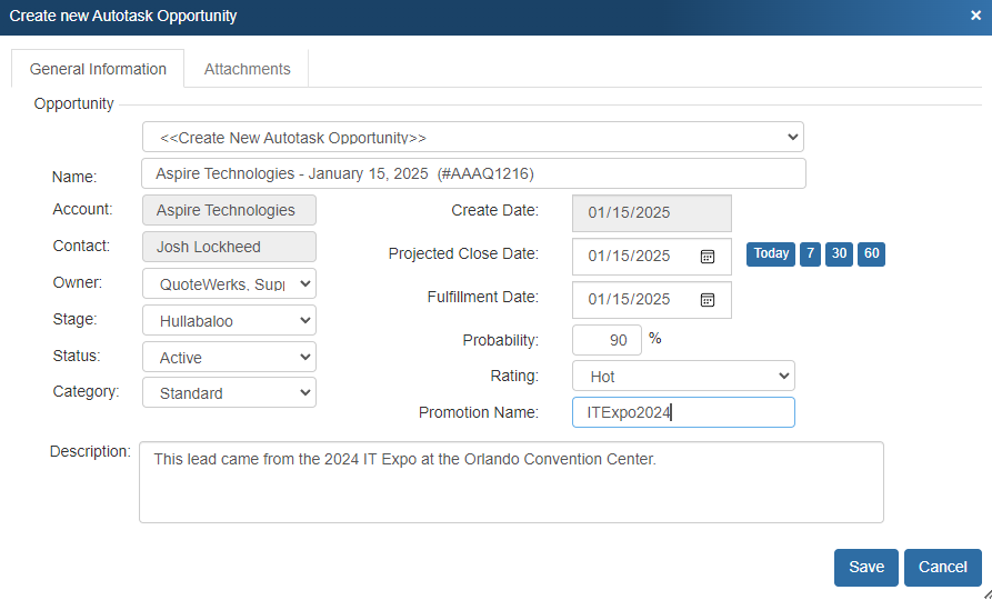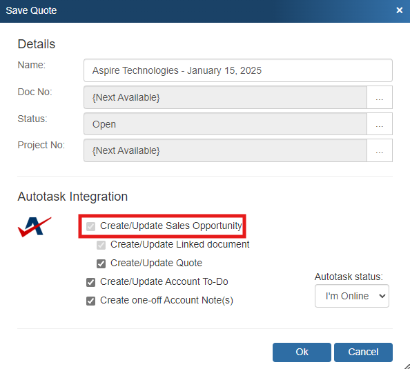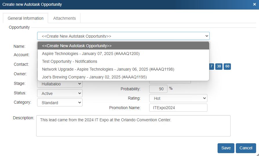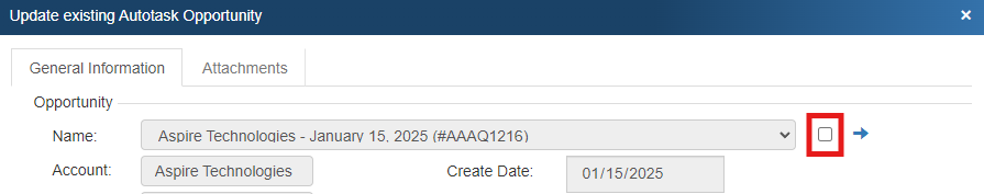 This option will create or update an Autotask opportunity or attach to an existing opportunity in Autotask.